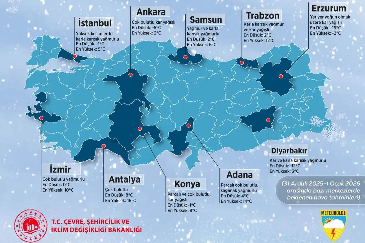 Meteoroloji'nin verilerine göre, 2025’in son günü ile 2026’nın ilk gününde yurt genelinde soğuk ve yağışlı hava etkisini gösterecek. Hava sıcaklıklarının düşmesiyle birlikte birçok bölgede yağış bekleniyor.