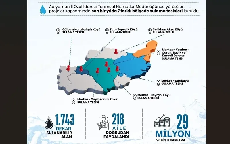 Adıyaman İl Özel İdaresi 2015 yılında Kırsal Kalkınma Yatırımları kapsamında; kırsal bölgelerde istihdamı artırmak, tarımsal üretimi güçlendirmek ve çiftçilerin refahını yükseltmek amacıyla önemli sulama projelerini hayata geçirdi.Bu kapsamda, Gölbaşı Karabahşili Köyü Sulama Tesisi , Tut Tepecik Köyü Sulama Tesisi, Çelikhan Aksu Köyü Sulama Tesisi, Merkez Yaylakonak Sulama Tesisi Merkez Doyran Köyü Sulama Tesisi, Merkez Sarıkaya Köyü Sulama Tesisi, Merkez Yazıbaşı Köyü Sulama Tesisleri 2025 yılı içerisinde tamamlanarak hizmete sunulmuş olup bu projelerin tamamlanmasıyla vatandaşların bir çok alanda kolaylık yaşaması sağlanmıştır.