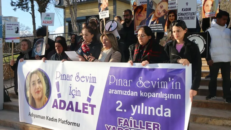 Adıyaman Kadın Platformu, Mimar Sinan Kültür Parkı güney kapısında düzenlediği basın açıklamasında 22 Şubat 2024'te öldürülen sağlık çalışanı Pınar Sevim için adalet çağrısı yaptı. Yapılan açıklamada, Anne Zeycan Sevim, "Adalet istiyorum, kızımın kanı yerde kalmasın" ifadelerini kullandı. Karar duruşmasının 6 Mart 2026'da Şanlıurfa Siverek Adliyesi'nde görüleceği bildirildi. Açıklamada, 22 Şubat 2024 tarihinde evli olduğu erkek Rıdvan Bulunmaz tarafından darp edilerek ve silahla öldürülen 28 yaşındaki sağlık çalışanı Pınar Sevim'in yaşam hakkının etkin işletilmeyen koruma mekanizmaları nedeniyle elinden alındığı kaydedildi.