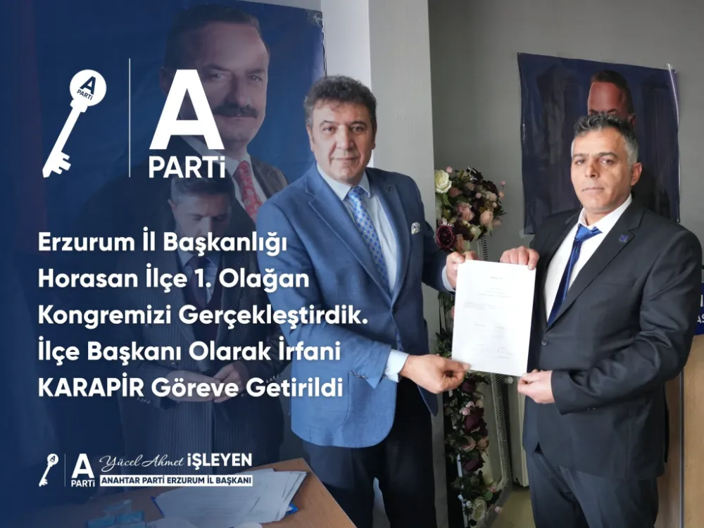 Anahtar Parti Horasan İlçe Başkanlığı görevine İrfani Karapir seçildi. Yeni ilçe başkanının belirlenmesinin ardından Anahtar Parti Erzurum İl Başkanı Yücel Ahmet İşleyen, yazılı bir açıklama yaparak Karapir’i tebrik etti.