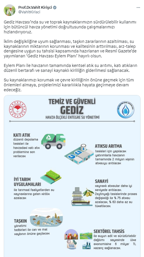 Bakan Kirişci, açıklamasında “Gediz Havzası’nda su ve toprak kaynaklarımızın sürdürülebilir kullanımı için bütüncül havza yönetimi doğrultusunda çalışmalarımızı hızlandırıyoruz. İklim değişikliğine uyum sağlanması, taşkın zararlarının azaltılması, su kaynaklarının miktarının korunması ve kalitesinin arttırılması, arz-talep dengesine uygun su tahsisi kapsamında hazırlanan ve Resmi Gazete’de yayımlanan ‘Gediz Havzası Eylem Planı’ hayırlı olsun. Eylem Planı ile havzanın tamamında kentsel atık su arıtımı, katı atıkların düzenli bertarafı ve sanayi kaynaklı kirliliğin giderilmesi sağlanacak. Su kaynaklarımızı korumak ve çevre kirliliğinin önüne geçmek için tüm önlemleri almaya, projelerimizi kararlılıkla hayata geçirmeye devam edeceğiz.” ifadelerini kullandı.