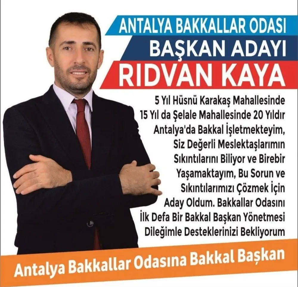 Antalya Bakkallar ve Bayiler Odası’nın önümüzdeki Pazar günü gerçekleştirilecek genel kurulu öncesi adaylar arasındaki yarış kızışıyor. "Kırmızı" pusula ile seçime girecek olan Rıdvan Kaya, iddialı projeleri ve esnafa yönelik çağrısıyla dikkatleri üzerine çekti.
