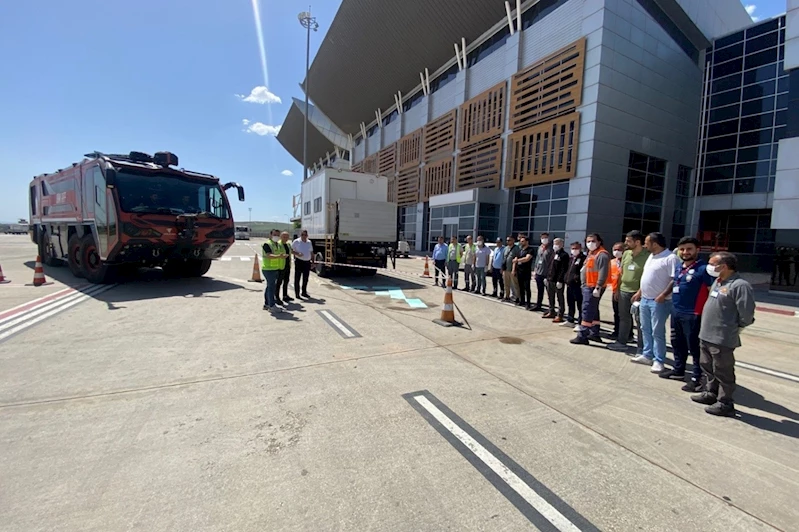 Eğitim senaryosu kapsamında, bir yolcu uçağına hizmet veren yer hizmet kuruluşuna ait ambulift aracı (engelli ve yaşlı yolcuların uçağa iniş-binişini kolaylaştıran asansörlü araç), apron sahasında hareket halindeyken yakıt sızıntısı simüle edildi.