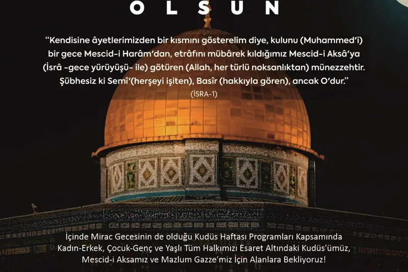 Programda, Kur'an'ı Kerim’in İsra Suresi'nde buyurulan Peygamber Efendimizin Mescid-i Haram'dan Mescid-i Aksa'ya yaptığı gece yolculuğu hatırlatılacak, Kudüs’ün Müslümanlar için önemi ve Gazze’deki zor yaşam koşulları gündeme getirilecek.