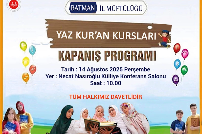Batman Müftülüğü, 2025 yılı Yaz Kur’an Kurslarının kapanış programını 14 Ağustos Perşembe günü saat 10.00’da Necat Nasıroğlu Külliyesi Konferans Salonu’nda düzenleyecek.