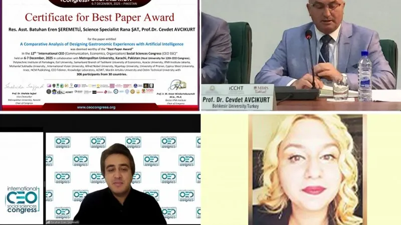 Balıkesir Üniversitesi öğrencisi ve Adıyaman Üniversitesi Turizm Fakültesi Turizm Rehberliği Bölümü akademisyeni Arş. Gör. Batuhan Eren Şeremetli, Balıkesir Üniversitesi öğrencisi Bilim Uzmanı Rana Şat ve Turizm Fakültesi Turizm İşletmeciliği Bölümü akademisyenlerinden, Rektör Yardımcısı Prof. Dr. Cevdet Avcıkurt, tarafından sunulan “A Comparative Analysis of Designing Gastronomic Experiences With Artificial Intelligence” başlıklı bildiri, 6-7 Aralık 2025 tarihleri arasında Pakistan’ın Karachi kentinde Metropolitan University ev sahipliğinde düzenlenen ve 30 ülkeden 306 bildirinin yer aldığı 12th International CEO Social Sciences Congress’te “Best Paper Award / En İyi Bildiri” ödülü ile ödüllendirildi.