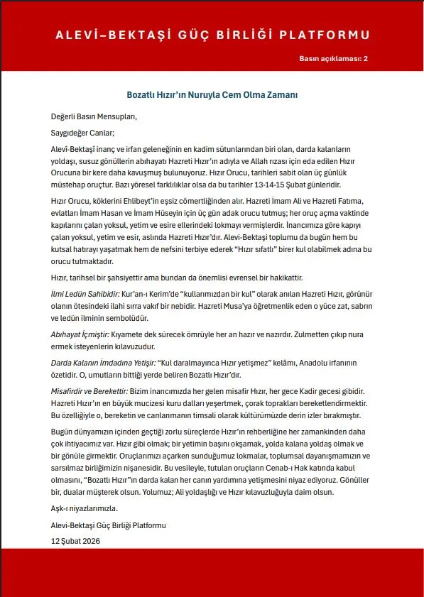 Bugün dünyamızın içinden geçtiği zorlu süreçlerde Hızır’ın rehberliğine her zamankinden daha çok ihtiyacımız var. Hızır gibi olmak; bir yetimin başını okşamak, yolda kalana yoldaş olmak ve bir gönüle girmektir. Oruçlarımızı açarken sunduğumuz lokmalar, toplumsal dayanışmamızın ve sarsılmaz birliğimizin nişanesidir. Bu vesileyle, tutulan oruçların Cenab-ı Hak katında kabul olmasını, “Bozatlı Hızır”ın darda kalan her canın yardımına yetişmesini niyaz ediyoruz. Gönüller bir, dualar müşterek olsun. Yolumuz; Ali yoldaşlığı ve Hızır kılavuzluğuyla daim olsun.