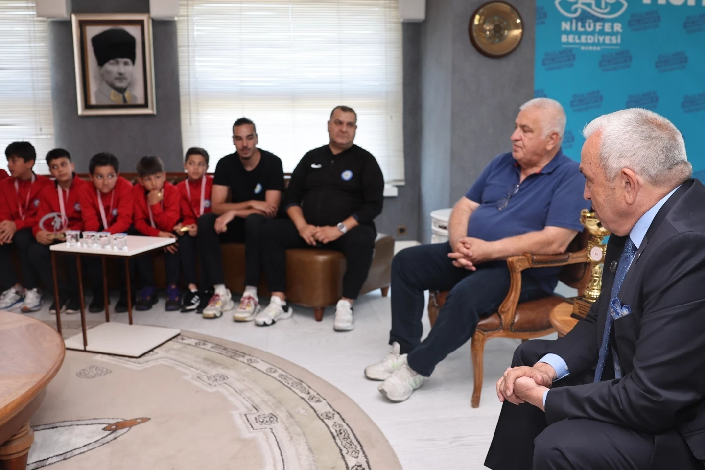 BURSA (İGFA) - U11 Minik Erkekler Yerel Ligi 2024-2025 sezonunda 14 maçın 13’ünü kazanarak, Bursa 2’ncisi olan Nilüfer Belediyespor oyuncuları ve teknik ekibi, Nilüfer Belediye Başkanı Şadi Özdemir’i ziyaret etti. Nilüfer Belediyesi Halk Evi Başkanlık Makamı’nda gerçekleşen ziyarette sporcular ve teknik ekibin yanı sıra Nilüfer Belediyespor Başkanı Muharrem Or, Asbaşkan İlker Mehmet Şener, baş antrenör Erdem Kaçmaz, yardımcı antrenör Arda Çitoğlu, kulüp yöneticileri ve veliler de yer aldı.