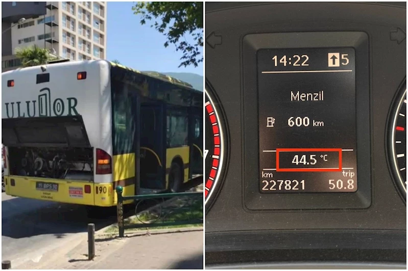 Termometrelerin 44 dereceyi gösterdiği şehirde, bir belediye otobüsü sıcaklığa dayanamayarak yolda kaldı.