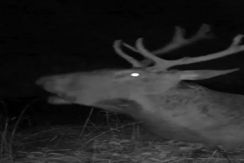 Gece saatlerinde ormanlık alanda görüntülenen kızıl geyik, attığı nara ile çevredeki sessizliği bozdu.