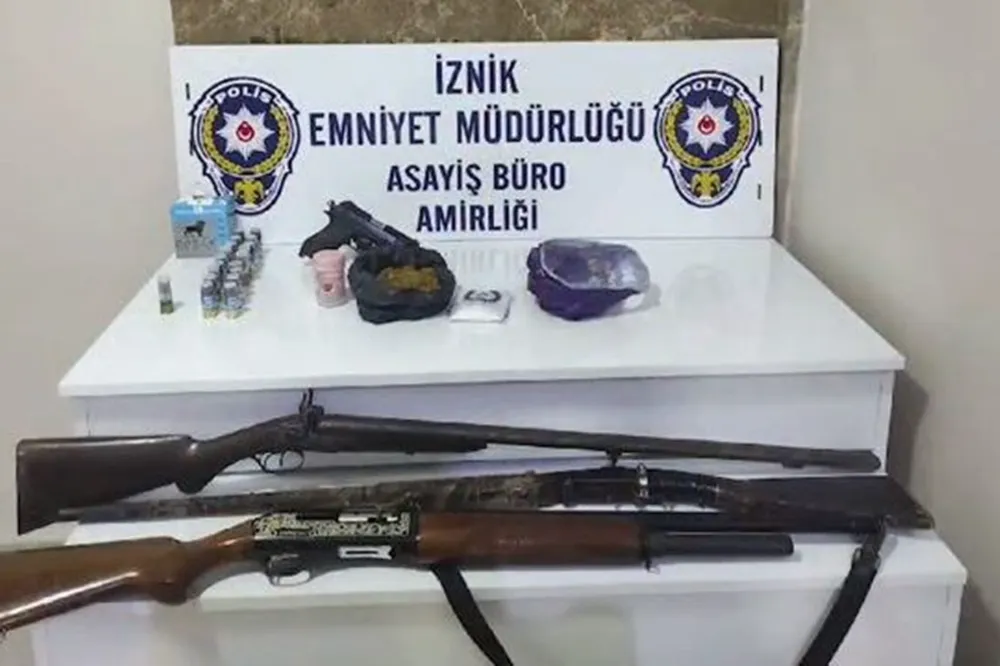 Narkotik Suçlarla Mücadele Şube Müdürlüğü, İznik İlçe Emniyet Müdürlüğü ile birlikte yürütülen çalışmalarda; Bursa ve İznik merkezli 7 ayrı adreste uyuşturucu veya uyarıcı madde satışı yapmak ve "Ateşli Silahlar Kanununa Muhalefet (6136 SKM)" suçlarını işledikleri tespit edilen toplam 4 şahıs yakalanarak gözaltına alındı.