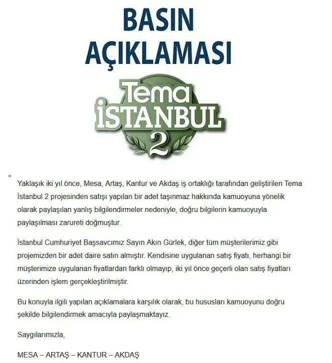 Tartışmaların ardından Mesa-Artaş-Kantur-Akdaş iş ortaklığı tarafından yazılı bir açıklama yapıldı. Açıklamada, Akın Gürlek’in projeden bir daire satın aldığı doğrulandı.