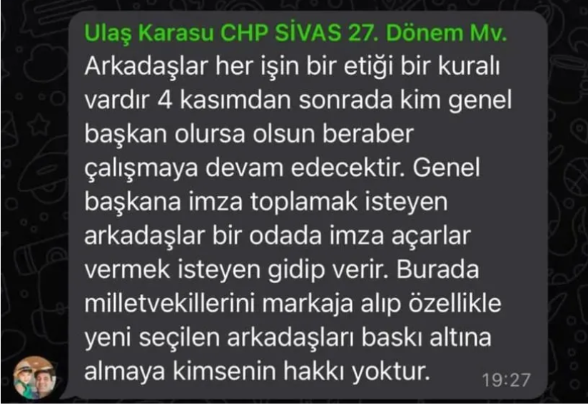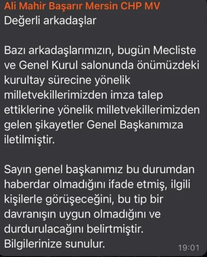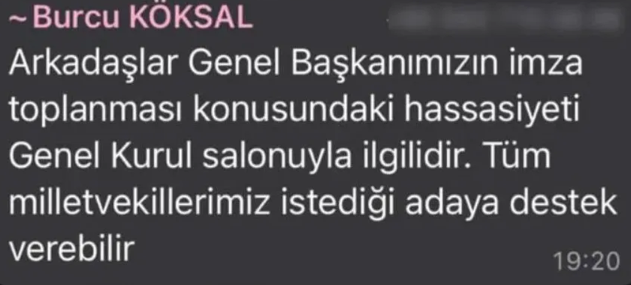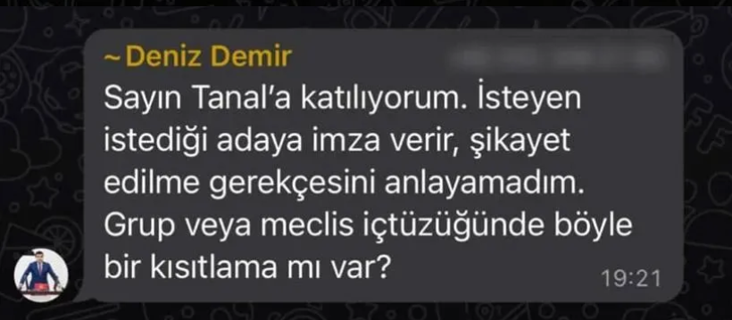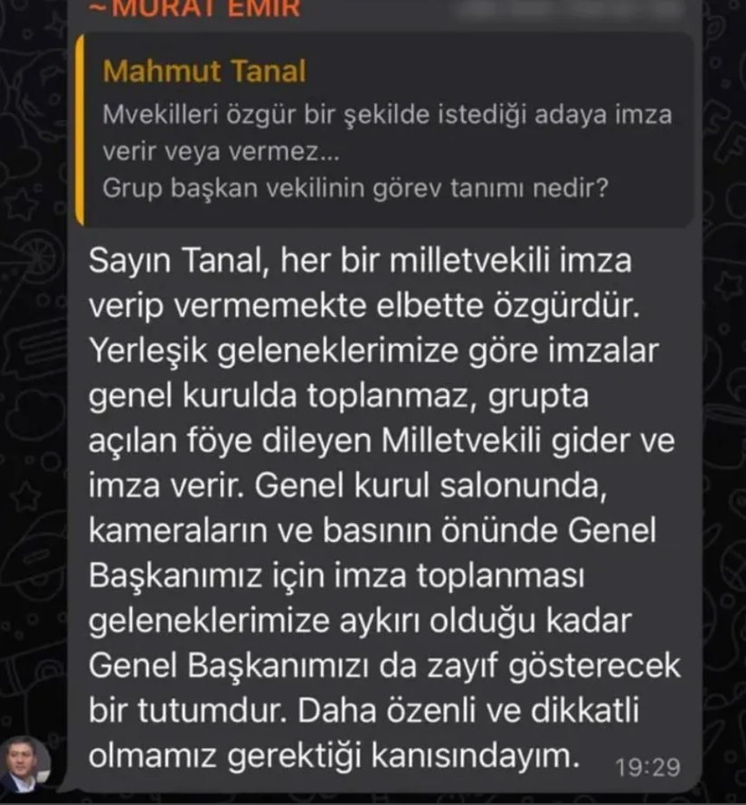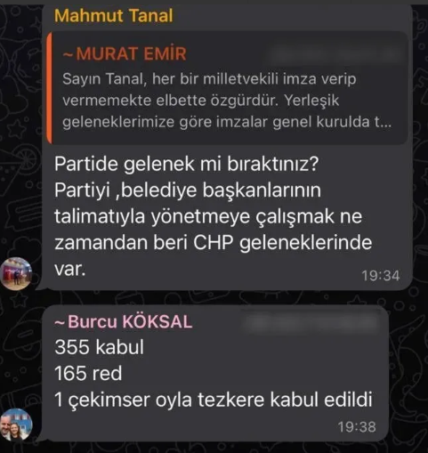 Milletvekili Deniz Demir ve Grup Başkanvekili Burcu Köksal’ın başlattığı imza organizasyonu bazı milletvekilleri tarafından tepki çekti. WhatsApp konuşmaları sırasında CHP Öilletvekili Mahmut Tanal'ın 'CHP'yi belediye başkanlarının talimatıyla yönetmeyi istemek' ifadeleri ise dikkat çekti.