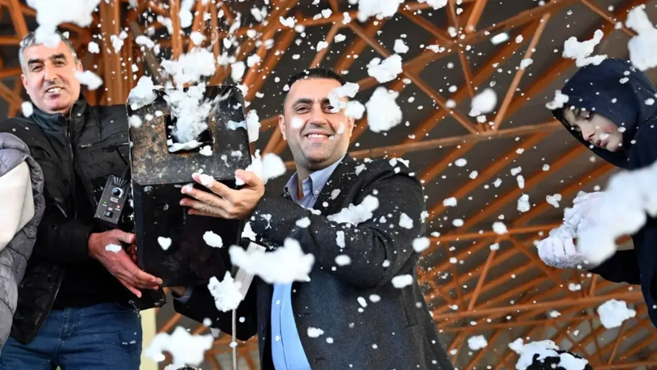 Çocuklarla kartopu oynayan Başkan Kozay, yapay kar makinası ile çocukların coşkusunu zirveye ulaştırdı.