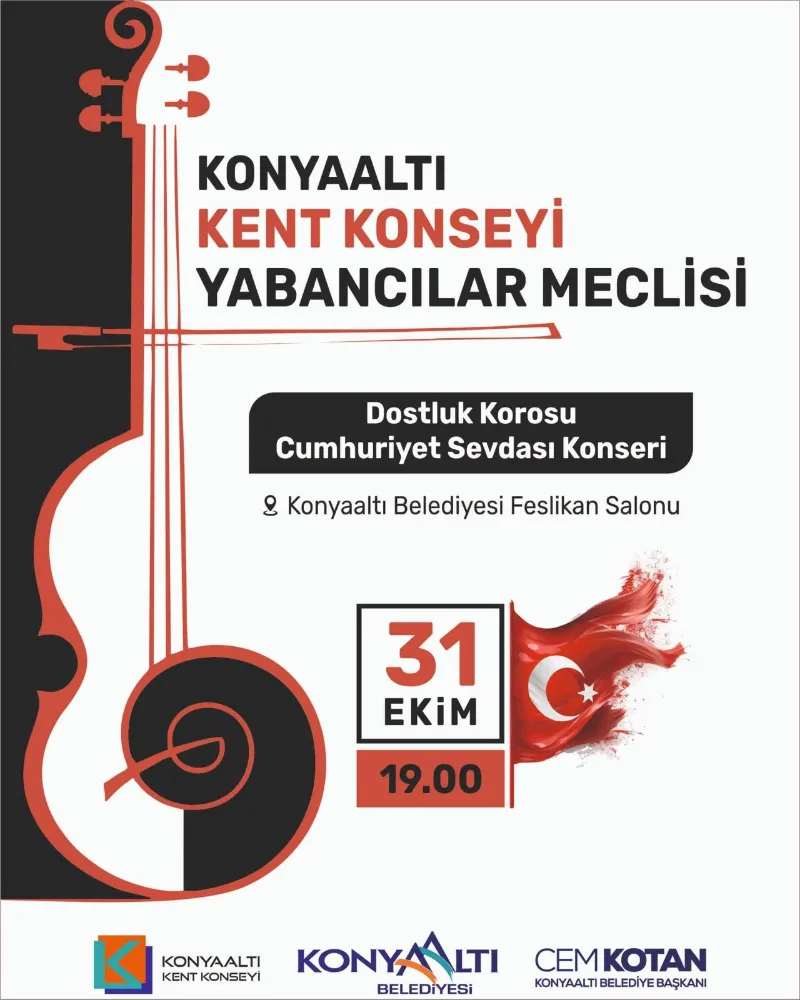 Dün, 101. Türkiye Cumhuriyeti Yılı'na özel olarak düzenlenen "Cumhuriyet Sevdası" konseri, Konyaaltı Belediyesi Feslikan Salonu'nda büyük bir coşkuyla gerçekleştirildi. Bu kültürel etkinlik, milli, klasik ve Türk pop müziğinden çeşitli eserlerin seslendirilmesiyle izleyicilere unutulmaz anlar yaşattı.