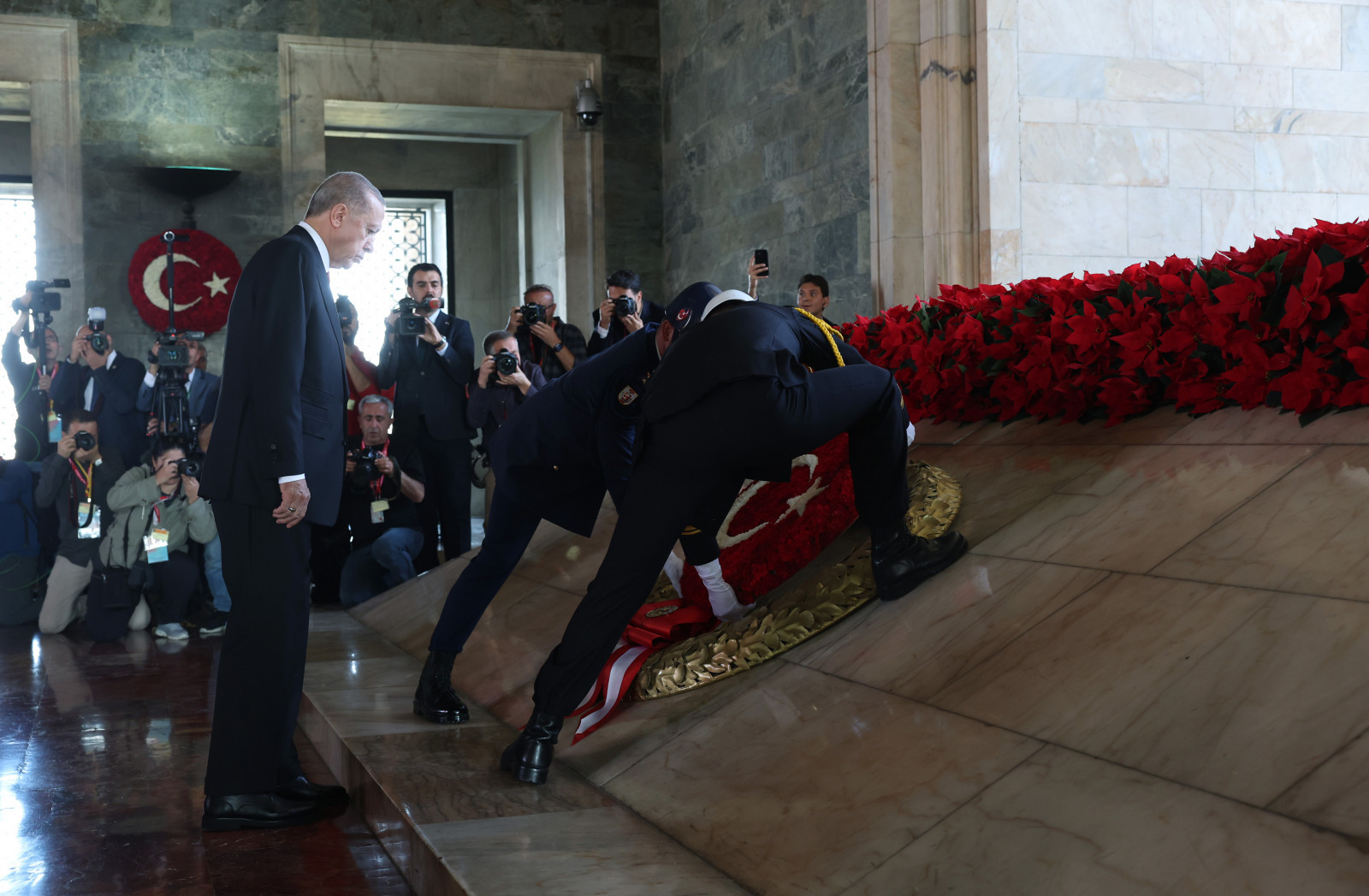 Cumhuriyet’in 100’üncü yılı dolayısıyla, Cumhurbaşkanı Recep Tayyip Erdoğan ve devlet erkanının katılımıyla Anıtkabir’de yapıldı. Erdoğan başkanlığındaki heyet, saat 11.00’de Anıtkabir’i ziyaret etti. Erdoğan ve beraberindeki heyetin Arslanlı Yol’dan geçerek Atatürk’ün mozolesine üzerinde ay yıldız bulunan çelenk bırakmasının ardından saygı duruşunda bulunuldu ve İstiklal Marşı okundu. Törende; Türkiye Büyük Millet Meclisi (TBMM) Başkanı Numan Kurtulmuş, Cumhurbaşkanı Yardımcısı Cevdet Yılmaz, CHP Genel Başkanı Kemal Kılıçdaroğlu, MHP Genel Başkanı Devlet Bahçeli, İYİ Parti Genel Başkanı Meral Akşener, Cumhurbaşkanlığı Kabinesi üyeleri, yüksek yargı organlarının başkanları, Genelkurmay Başkanı Orgeneral Metin Gürak ve kuvvet komutanları da Aslanlı Yol’dan geçerek mozoleye çıktı.