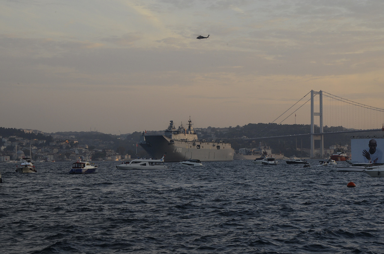 Türk Silahlı Kuvvetlerinin (TSK) en büyük savaş gemisi milli üretim TCG Anadolu TCG Anadolu’nun rehberliğindeki İstanbul Boğazı’ndaki geçişe 100 geminin yanı sıra F-16 ve F4E uçakları ve helikopterler de eşlik etti. Tören öncesinde SOLOTÜRK ve Türk Yıldızları özel uçuş gösterisiyle gökyüzüne “100” yazıldı. İstanbul Fırkateyni, Pirireis Denizaltısı ve Derya gemisi de hizmete girmemesine rağmen geçit töreninde yer aldı. İstanbul Fırkateyni, MİLGEM projesi kapsamında Türk mühendislerinin tasarladığı, yerli ve milli imkanlarla üretilen ve donatılan ilk Türk fırkateyni olma özelliğini taşıyor.