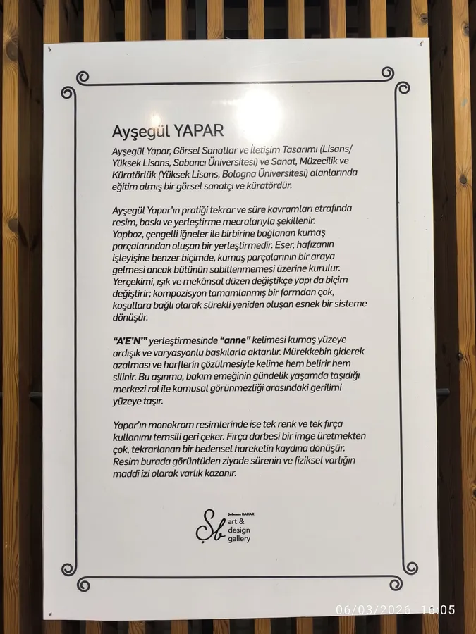 Resim, kolaj, yerleştirme, video ve fotoğraf gibi farklı mecralarda üretilen işler aracılığıylakişisel ve kolektif hafıza arasındaki geçirgen eşik tartışmaya açılıyor.