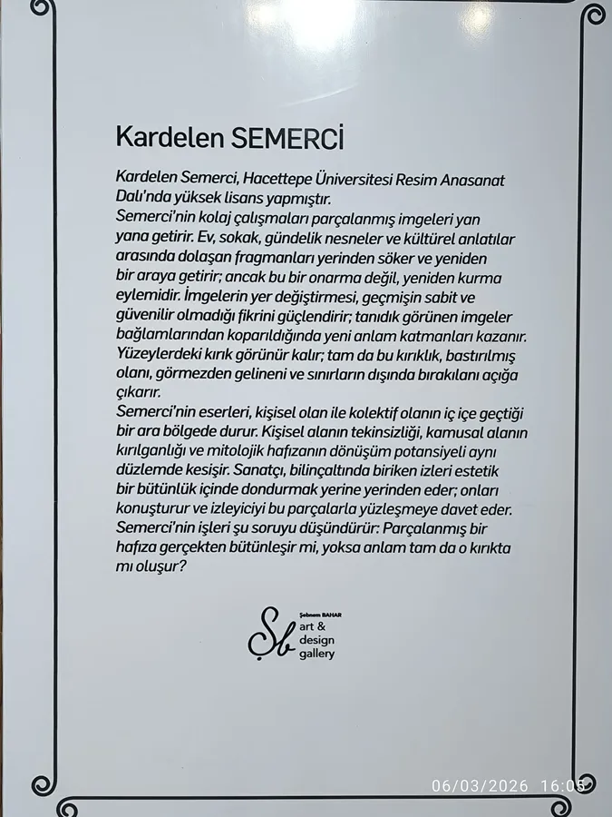 Kardelen Semerci, kolajlarında parçalanmış imgeleri yeniden kurarak geçmişin sabitliğini sorguluyor ve kırığın içinde oluşan anlamı görünür kılıyor.