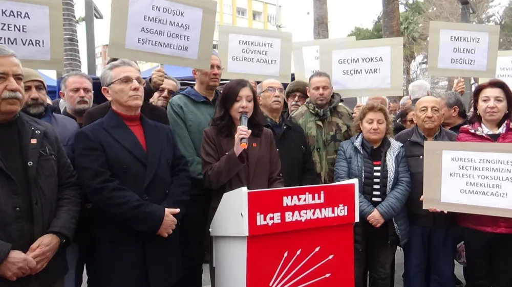 Aydın’ın Nazilli ilçesinde emeklilere verilen zam oranlarına tepki amacıyla Cumhuriyet Halk Partisi (CHP) Nazilli İlçe Başkanlığı tarafından Kent Meydanı’nda basın açıklaması düzenlendi. Açıklamaya Nazilli Belediye Başkanı Dr. Ertuğrul Tetik, CHP Nazilli İlçe Başkanı Av. Aslıhan Ökmen, Türkiye Emekliler Derneği (TÜED) Nazilli Şube Başkanı Orhan Oruç, Atatürkçü Düşünce Derneği (ADD), Eğit-Der, Nazilli Bedensel Engelliler Derneği, Sümerbank Emekliler Derneği yöneticileri ve çok sayıda vatandaş katıldı.