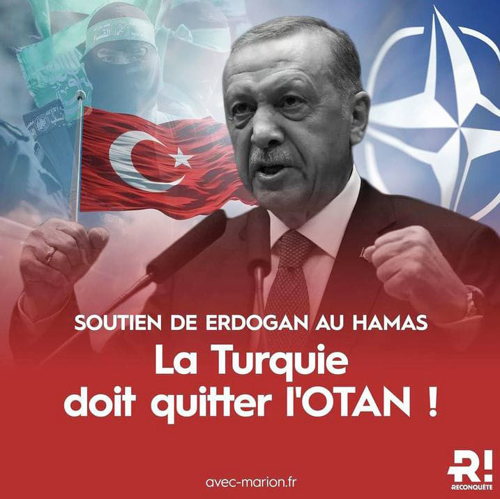 Partinin liderleriden Marion Marechal, 25 Ekim’deki açıklamasından “Erdoğan, ‘özgürlük savaşçıları’ olarak tanımladığı Hamas barbarlarını desteklediğini açıkladı. Askeri ittifakımız içinde Türkiye'nin varlığına hala nasıl tahammül edebiliriz?” dedi.