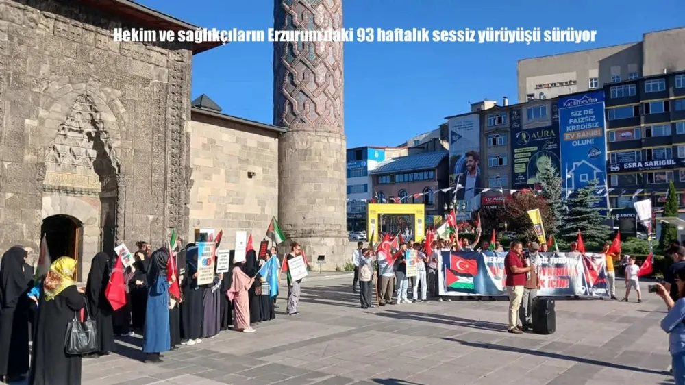 Erzurum'da sağlık çalışanları, İsrail'in Gazze'ye yönelik saldırılarını protesto etmek amacıyla 93. haftada sessiz yürüyüş düzenledi. Lala Mustafa Paşa Cami önünde toplanan grup, Türk, Filistin ve Doğu Türkistan bayraklarıyla Yakutiye Medresesi'ne kadar yürüdü. Yürüyüş boyunca slogan atılmadı ve sessizce yüründü. Katılımcılar, Gazze'deki sivil ölümleri ve sağlık çalışanlarına yönelik saldırıları kınadı.