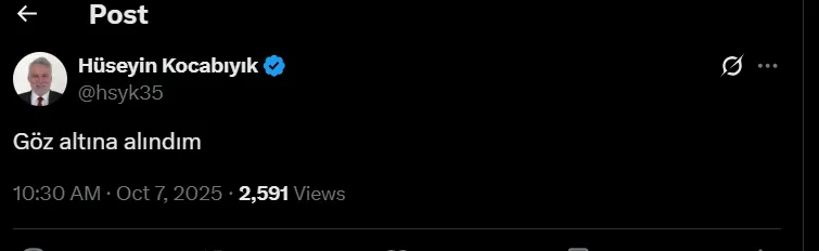 Eski AKP milletvekili Hüseyin Kocabıyık, gözaltına alındığını X (Twitter) hesabından yaptığı paylaşımla duyurdu. Kocabıyık, paylaşımında gözaltı kararının gerekçesine dair detay vermezken, “Şu anda gözaltına alınıyorum” ifadelerini kullandı.