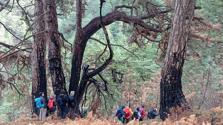 Aylar sonra aynı coğrafyada, bu kez yürüyüş botlarıyla patikalara çıkıldı. Köpek Pınarı’na doğru yükseldikçe, çam ormanları arasında yangının bıraktığı izler net bir şekilde görülüyordu. Kapkara olmuş çam ağaçlarının gövdeleri, yaşanan felaketin sessiz tanıklarıydı. Buna karşın doğa, tüm yaralarına rağmen kendini yavaş yavaş yenilemeye başlamıştı. Yeşeren topraklar umut verirken, yanmış ağaçlar insanın içini burkuyordu.