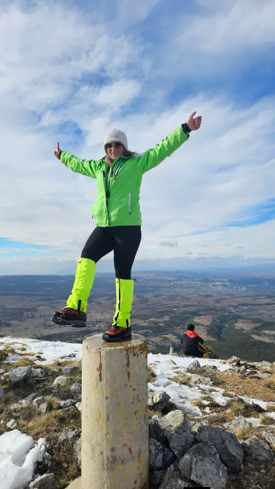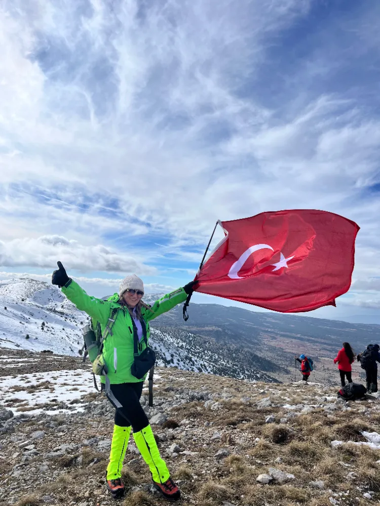 Zirveye ulaşıldığında rüzgâr daha sertti. Yükseklik insanın yüzüne çarpar ama aynı zamanda içini de açar. Her tırmanışta çantamda taşıdığım bayrağı o noktada açmak, benim için bir alışkanlık değil; bir hissin ve bağlılığın ifadesi. Rüzgârda dalgalanan bayrak, o anı sadece görsel değil, duygusal olarak da hafızaya kazıdı.
