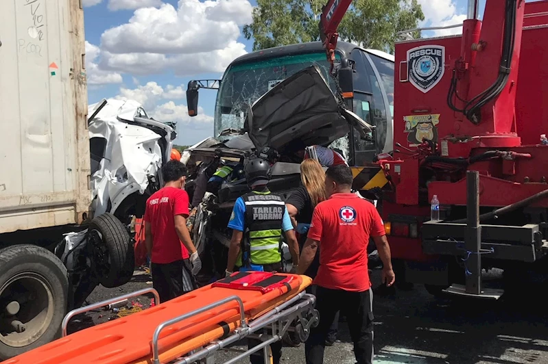 Yetkililer, bir yolcu otobüsü, üç spor arazi aracı ve bir konteyner kamyonunun karıştığı kazada altısı çocuk olmak üzere 12 kişinin öldüğünü söyledi.