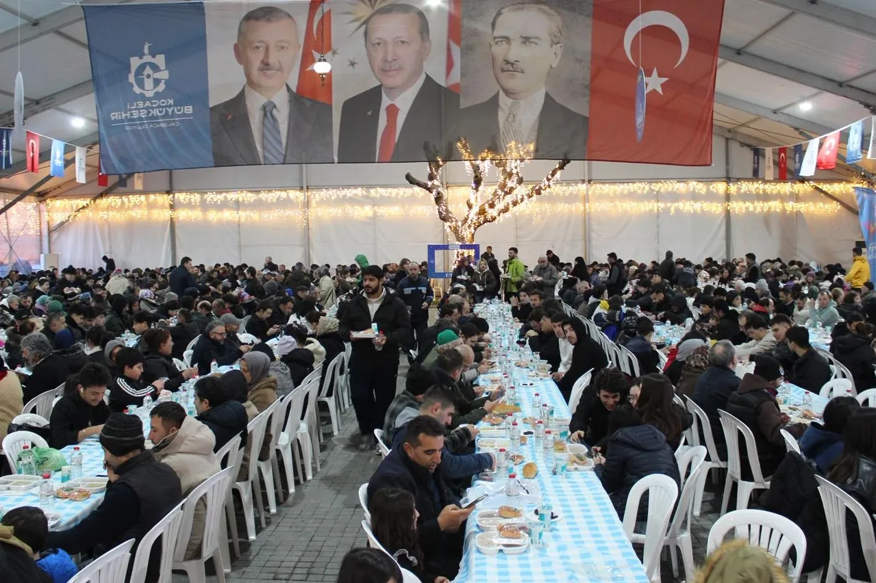 KOCAELİ (İGFA) - Kocaeli Büyükşehir Belediyesi, paylaşmanın ve dayanışmanın en güçlü şekilde hissedildiği mübarek Ramazan ayında geleneksel hale getirdiği iftar sofralarıyla vatandaşları bir araya getirmeyi sürdürüyor. Ramazan ayı boyunca devam eden iftar programlarının Gebze ayağında bir araya gelen vatandaşlar, aynı sofrada oruç açmanın huzurunu yaşıyor. Günün telaşı içinde iftara yetişemeyenler de Ramazan çadırında kurulan bereketli sofralara konuk oluyor. Büyükşehir Belediyesi’nin organizasyonuyla her gün en az 1.500 kişilik iftar verilirken, meydanda kardeşlik ve paylaşma görüntüleri yüzlerde tebessüm bırakıyor.