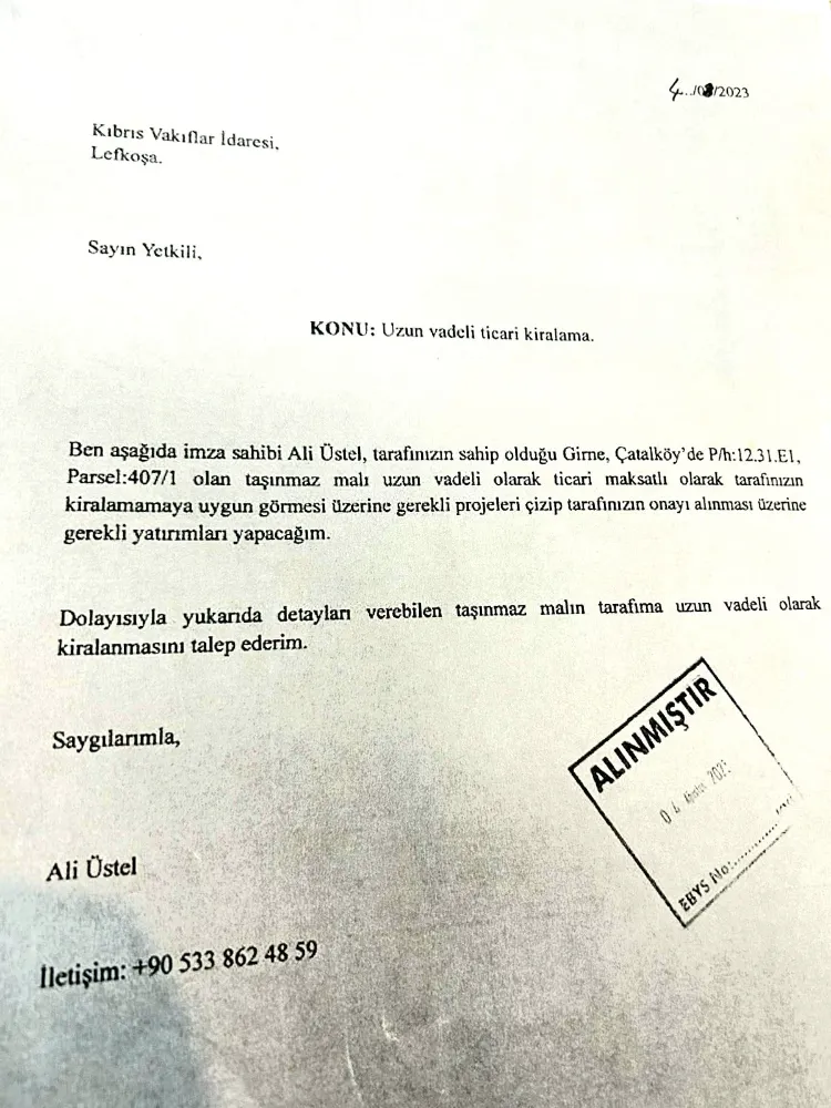 - Başbakan Ünal beyin selamı var. Kardeşi Ali Üstel bey Çatalköy'de boş olan 5 dönümlük bir vakıf arazisini kiralamak istiyor, gereğini yapar mısınız?