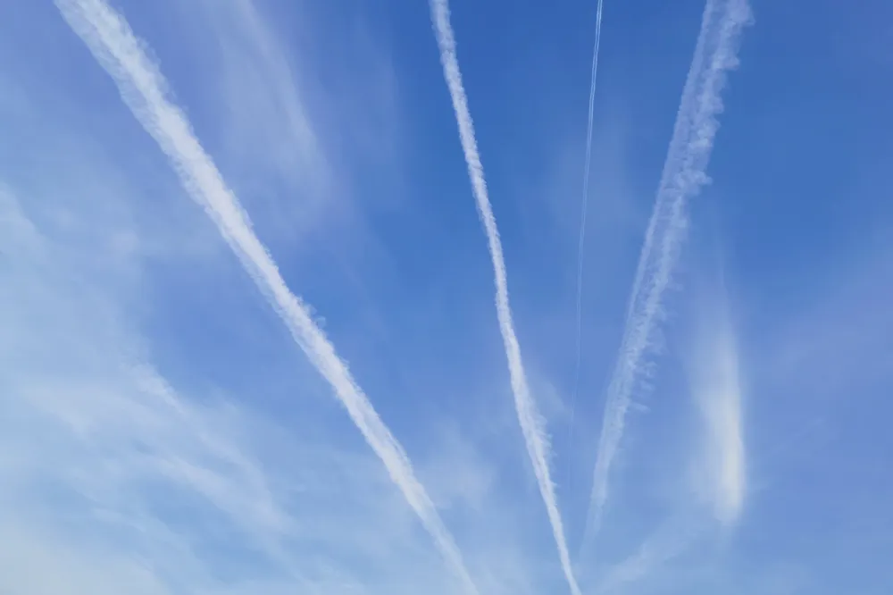Uçakların arkasında oluşan ve "kuyruk izi (contrail)" olarak bilinen iz, uçaklardan çıkan sıcak egzoz gazı nedeniyle oluşmaktadır.
