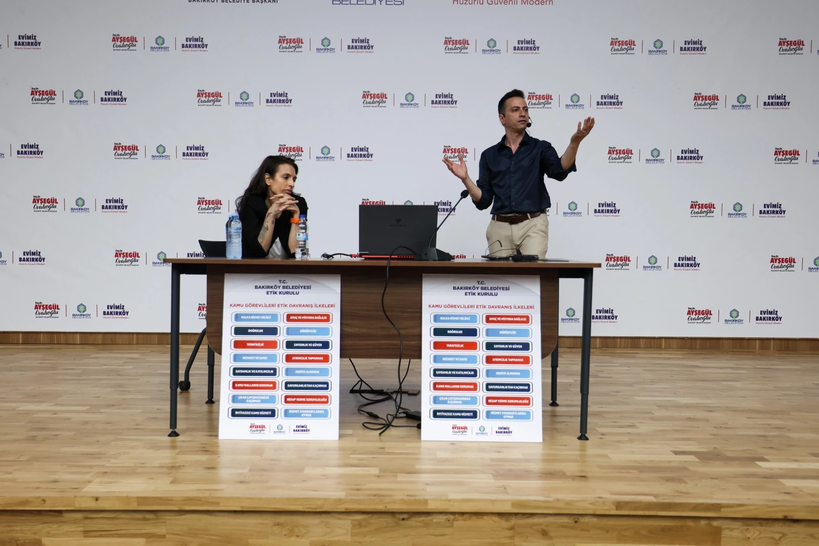 İstanbul Bakırköy Belediyesi Etik Kurulu’nun konferans salonunda düzenlediği toplantıda, “Kamu Görevlileri Etik Davranış İlkeleri” değerlendirildi. Belediye çalışanlarının katıldığı programda; halka hizmet bilinci, amaç ve misyona bağlılık, doğruluk, dürüstlük, tarafsızlık, saygınlık ve güven, nezaket ve saygı, ayrımcılık yapmamak, saydamlık ve katılımcılık, hediye almamak, kamu mallarını korumak, savurganlıktan kaçmak, çıkar çatışmasından kaçmak, hesap verme sorumluluğu, imtiyazsız kamu hizmeti ve hizmet standartlarına uymak konuları üzerine konuşuldu.