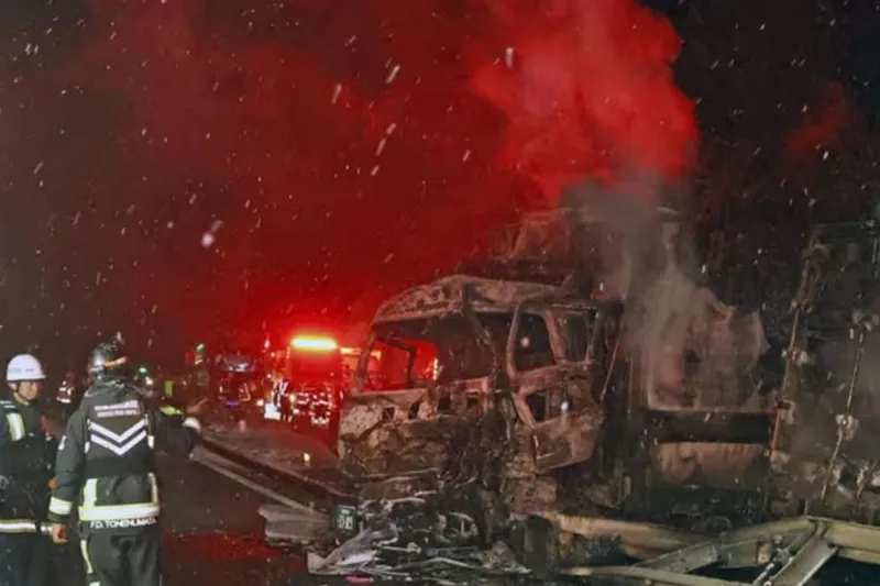 Kaza sonucu 20 aracın alev aldığı ve çıkan yangının yaklaşık 7,5 saatlik bir çalışmayla söndürülebildiği kaydedildi.