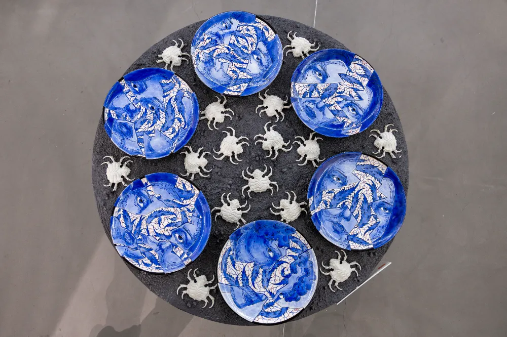 Eserde ikiye bölünen ve birbirinden uzakta konumlanan tabaklardan etrafa saçılan düşünceler, bireyin yaşamla olan bağlantılarının dağılmasını sembolize ediyor.