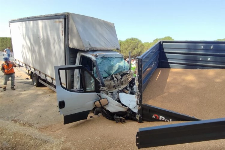 Erdoğan DEMİR / EDİRNE (İGFA) - Saat 07.20 sıralarında Keşan-Gelibolu karayolunda meydana gelen kazada, Gelibolu yönünden Keşan istikametine seyreden Mustafa Karayiğit yönetimindeki 52 ADS 569 plakalı kapalı kamyon, Keşan Devlet Hastanesi yakınlarında, aynı istikamette seyreden Saim Koca (68) yönetimindeki 22 ACP 663 plakalı traktörün buğday yüklü römorkuna arkadan çarptı.