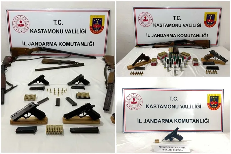 Aramalarda 10 adet ruhsatsız tabanca, 5 adet ruhsatsız av tüfeği, 10 adet tabanca şarjörü, 482 adet tabanca fişeği ile 45 adet av tüfeği fişeği ele geçirildi.
