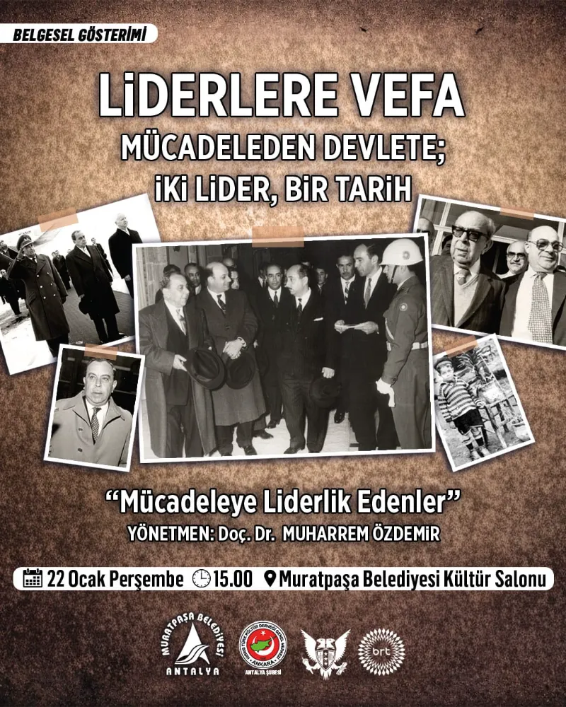 Kıbrıs Türk Kültür Derneği Antalya Şubesi LİDERLERE VEFA haftası son programında 22 Ocak 2026 Perşembe günü Muratpaşa Belediyesi Desteğiyle, Muratpaşa Belediyesi Kültür Salonunun da saat 15.00 de "MÜCADELEYE ÖNDERLİK EDENLER" Belgesel filmini Antalya halkına sunuyor. Milli Mücadele yılları Liderimiz Dr Fazıl KÜÇÜK ve Kurucu Cumhurbaşkanımız Rauf Raif DENKTAŞ’ın yakın çalışma arkadaşları ve aile fertlerine yer verilen belgeselde Liderlerin özel anları ve anılarına eşlik eden tanıkların hikayeleri yer alıyor.