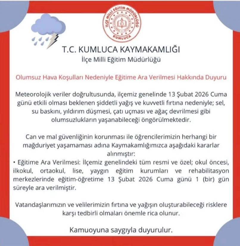 Antalya’nın Kumluca ilçesinde etkisini artıran yoğun yağış ve olumsuz hava koşulları nedeniyle eğitime 1 gün ara verildi. İlçe genelinde yaşanabilecek ulaşım aksaklıkları ve olası riskler göz önünde bulundurularak, Kumluca Kaymakamlığı ve İlçe Milli Eğitim Müdürlüğü tarafından 13 Şubat 2026 Cuma günü için tatil kararı alındı.