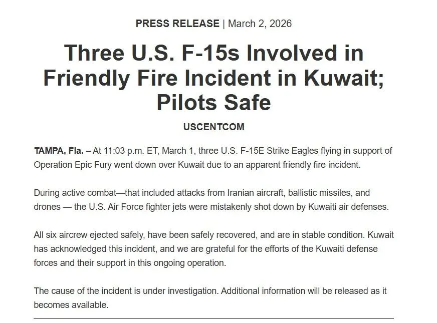 1 Mart akşamı Kuveyt hava sahasında Operation Epic Fury kapsamında görev yapan üç ABD Hava Kuvvetleri F‑15E Strike Eagle savaş uçağı, Kuveyt hava savunma sistemleri tarafından yanlışlıkla vuruldu. ABD Merkez Komutanlığı (CENTCOM) tarafından yapılan açıklamada, uçakların düşürülmesinin aktif çatışma sırasında gerçekleştiği ve İran’a ait uçaklar, balistik füzeler ile insansız hava araçlarının saldırıları sırasında meydana geldiği bildirildi. Yetkililer, olayın dost ateşi (friendly fire) sonucu olduğunu doğruladı.