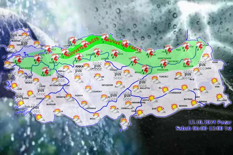 Meteoroloji'nin 13 Ekim Pazar gününe yönelik hava tahmin raporu yayımlandı. Türkiye geneli parçalı yer yer çok bulutlu olacağı Pazar günü, özellikle kuzey kesimi ile Çanakkale'nin iç kesimler ve Batı Akdeniz'in Toroslar kesiminde yerel sağanak ve gök gürültülü sağanak yağışlar bekleniyor.
