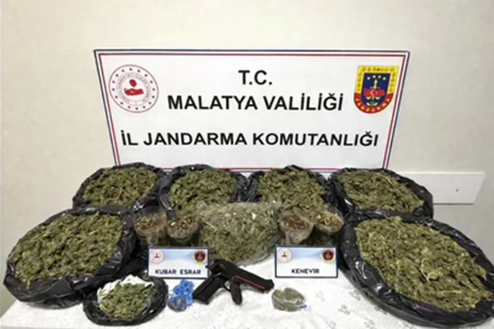 Malatya'da yapılan uyuşturucu operasyonunda, 7 kilogram esrar 27 kök kenevir bitkisi, 55 gram kenevir tohumu ile bir adet kuru sıkı tabanca ele geçirildi.
