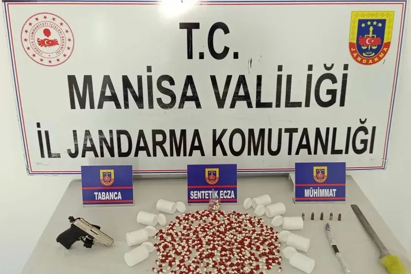 Yapılan aramalarda 516 sentetik ecza hap ile 1 pala, 1 bıçak ve 1 kurusıkı tabanca ele geçirildi.