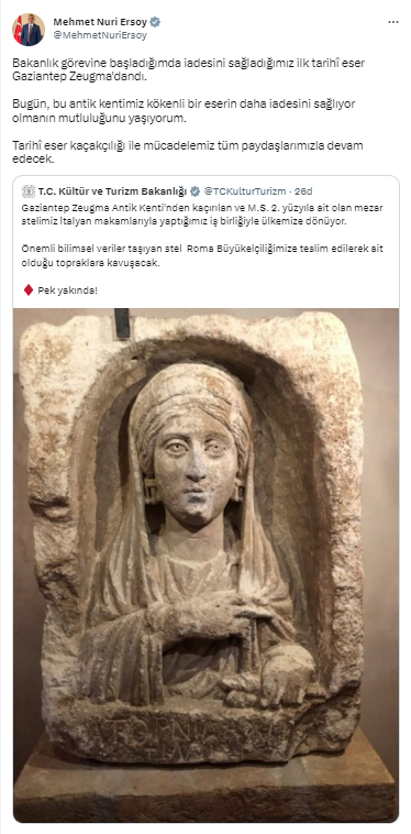 Kültür ve Turizm Bakanlığı’ndan konuya ilişkin yapılan açıklamada, “Gaziantep Zeugma Antik Kenti'nden kaçırılan ve M.S. 2. yüzyıla ait olan mezar stelimiz İtalyan makamlarıyla yaptığımız iş birliğiyle ülkemize dönüyor. Önemli bilimsel veriler taşıyan stel Roma Büyükelçiliğimize teslim edilerek ait olduğu topraklara kavuşacak.” denildi.