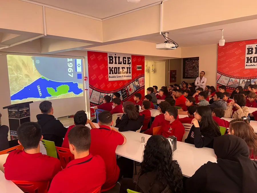 Etkinlik, okul yöneticilerinin yaptığı kapsamlı sunumla başladı. Öğrencilere, Filistin’in tarihsel süreci, bölgede yaşanan insani krizler ve dünya kamuoyunun desteğinin önemi aktarıldı. Sunumlarda Filistin’in yıllar içindeki toprak kayıpları ve günümüzdeki insani dram görseller eşliğinde paylaşıldı. Öğrenciler, dikkatle takip ettikleri bu bilgilendirmeden sonra Filistin halkına destek olmanın insani bir sorumluluk olduğunu dile getirdi.