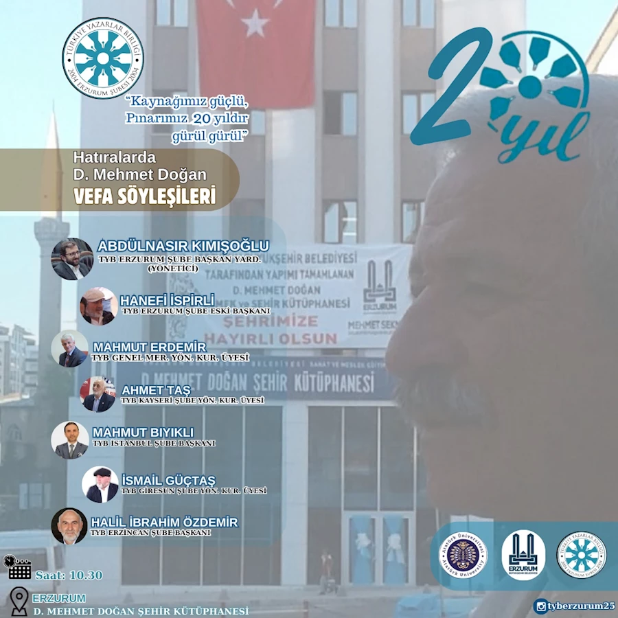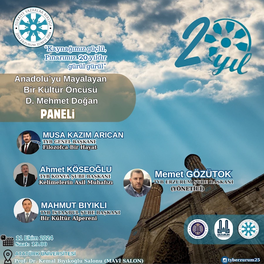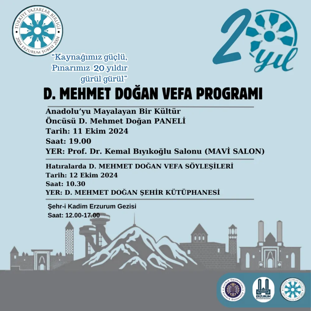Erzurum TYB Şubesi tarafından 11.10.2024 Cuma ve 12.10.2024 Cumartesi günü düzenlenecek olan D. Mehmet Doğan'a Vefa Paneli ne bütün halkımız davetlidir.