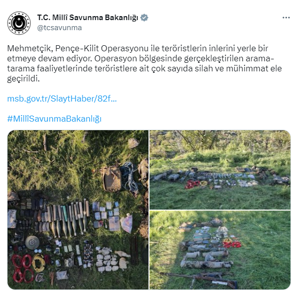 MSB’den yapılan açıklamaya göre, Mehmetçik, Pençe-Kilit Operasyonu ile teröristlerin inlerini yerle bir etmeye devam ediyor. Operasyon bölgesinde gerçekleştirilen arama-tarama faaliyetlerinde teröristlere ait çok sayıda silah ve mühimmat ele geçirildi.