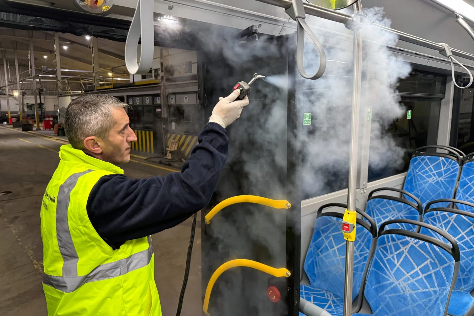Büyükşehir ekiplerinin düzenli ve titiz temizlik çalışmaları sayesinde belediye otobüsleri hem gözle görülen hem de gözle görülmeyen kirlerden arındırılarak ulaşımda hijyen ve güvenlik standartlarını en üst seviyeye taşınıyor.