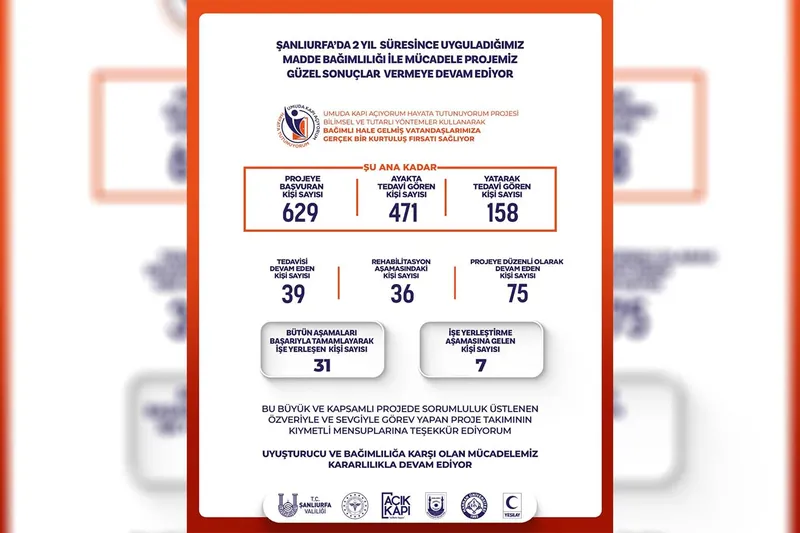 Şanlıurfa’da son iki yıldır uygulanan ‘Umuda Kapı Açıyorum Hayata Tutunuyorum Projesi’ olumlu sonuçlar vermeye devam ediyor. Şanlıurfa Valisi Hasan Şıldak, projeye ilişkin güncel verileri kamuoyuyla paylaştı.